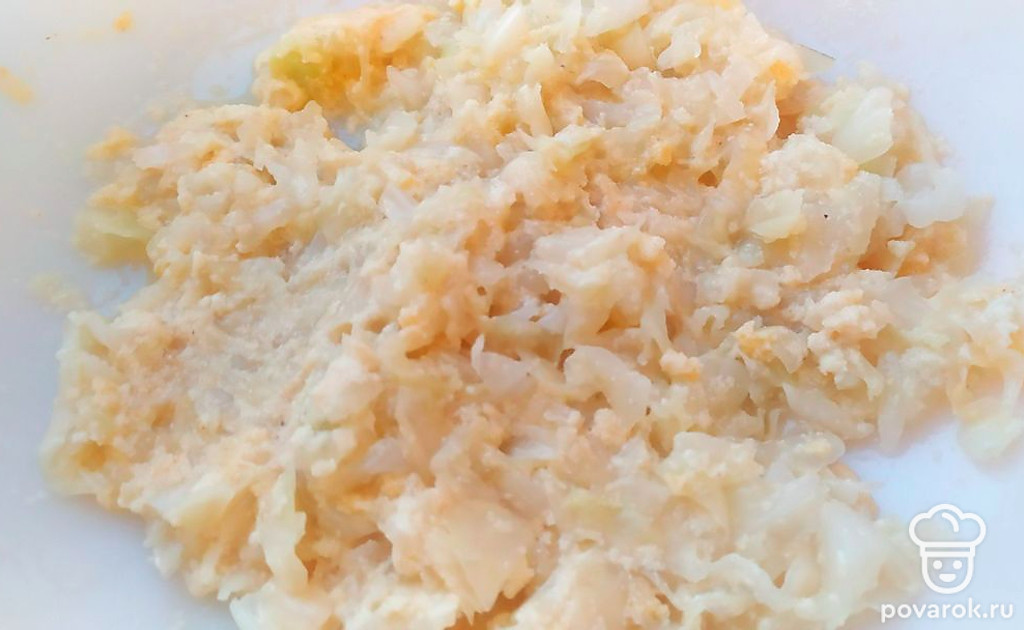 Отваренную капусту, слив лишнюю воду, добавляем в чашу и перемешиваем вилкой. Получается тесто для оладушек.