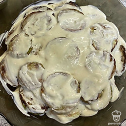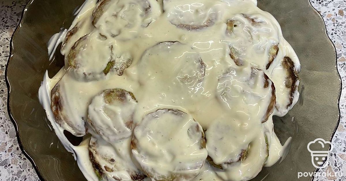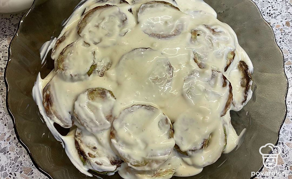 Обжаренные кабачки выложите слоями. Слои хорошо промажьте майонезом с чесноком.