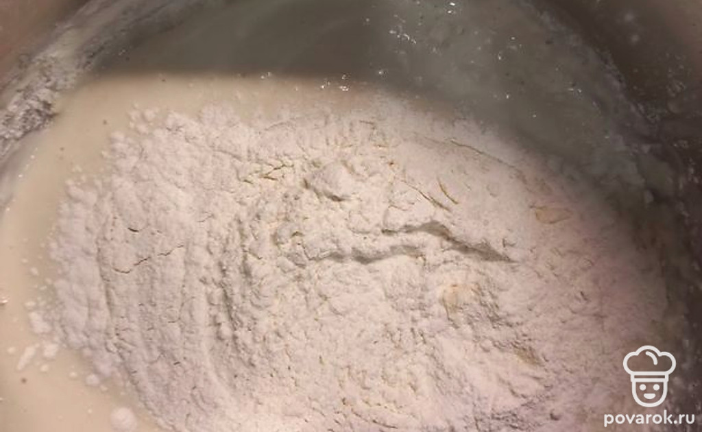 Добавить постепенно просеянную муку, замесить тесто. Убрать тесто в теплое место на 45 минут.