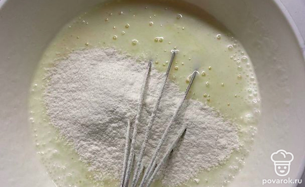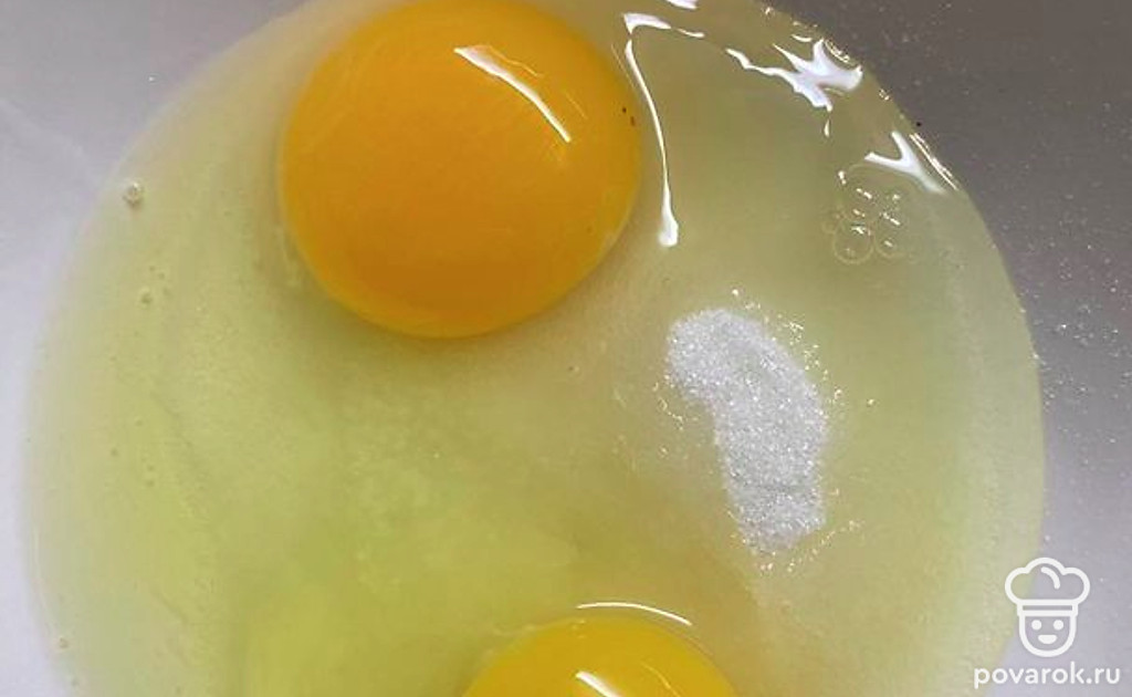 Затем отдельно сахар, соль и два яйца. Взбиваем.