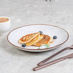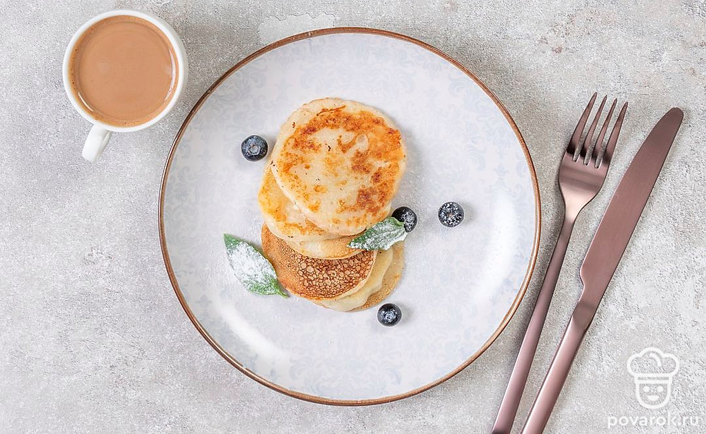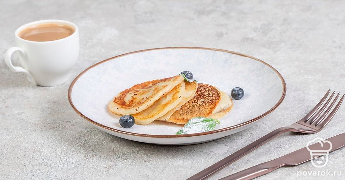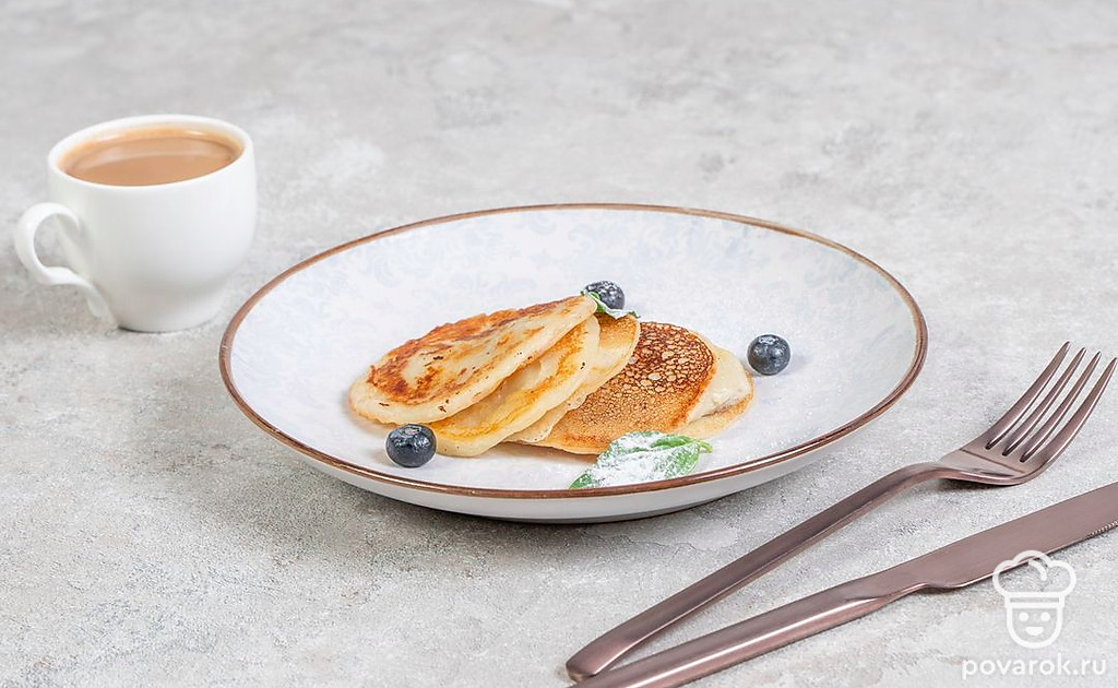 Выложите ароматные оладьи на небольшую тарелку, посыпьте сахарной пудрой, украсьте ягодами и подайте к столу вместе с чаем, кофе или какао.
