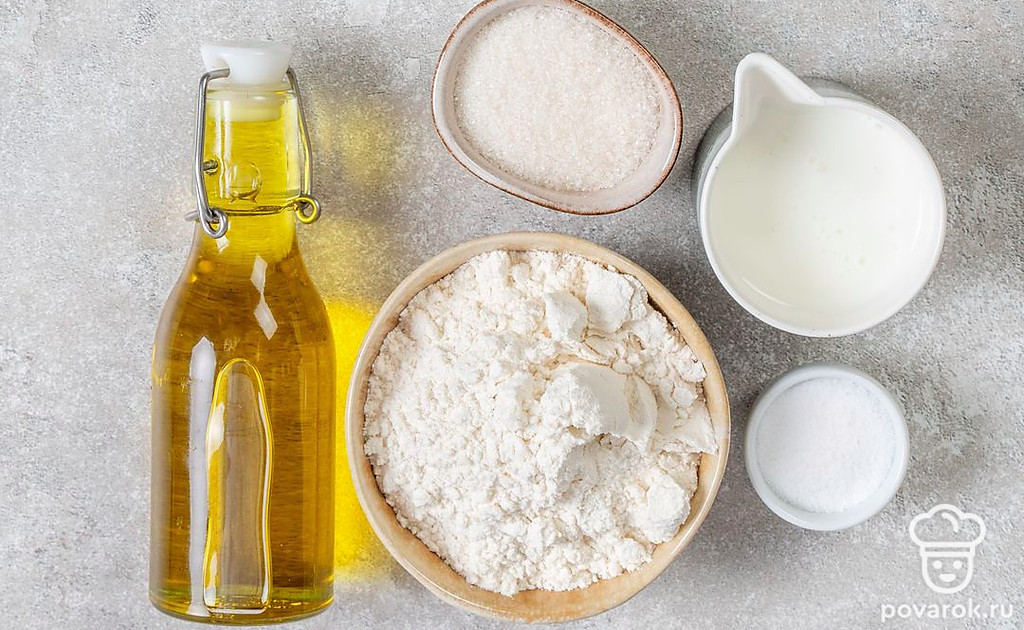 Влейте кефир в небольшую чашу. Добавьте сахар и соль по вкусу, перемешайте. Влейте в смесь растительное масло и всыпьте муку. Используя венчик, смешайте ингредиенты до однородного теста.
