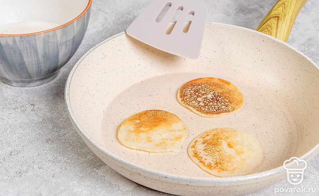 Поставьте сковороду на средний огонь и дождитесь, когда она разогреется. Используя ложку, выложите на сковороду немного теста. Обжарьте оладьи с обеих сторон до золотистой корочки.