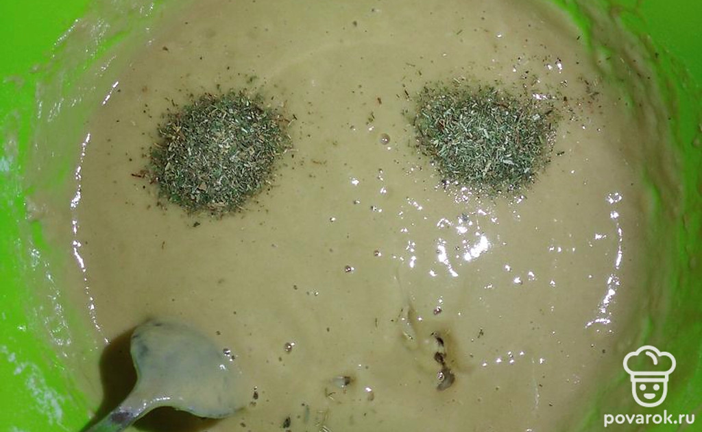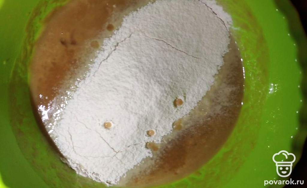 Дальше добавляем муку, соль, разрыхлитель и перемешиваем.