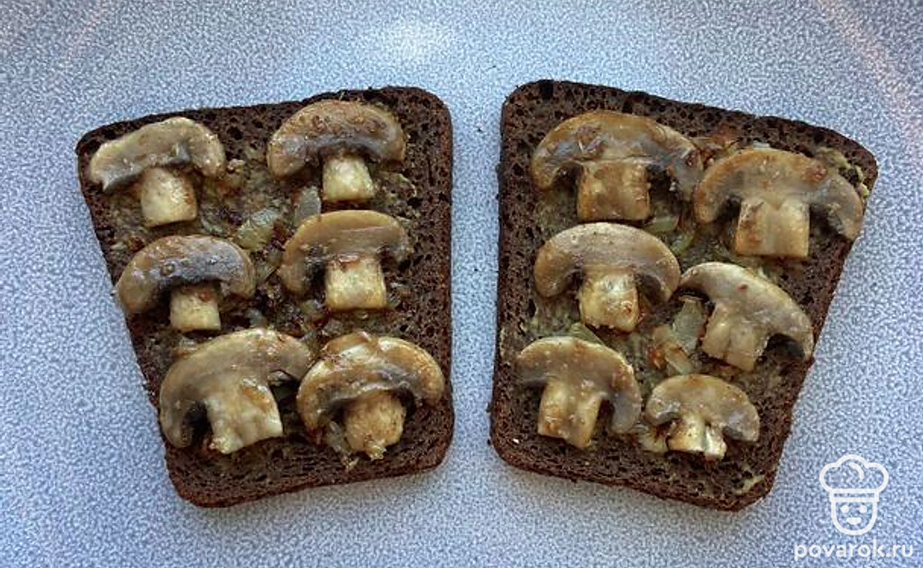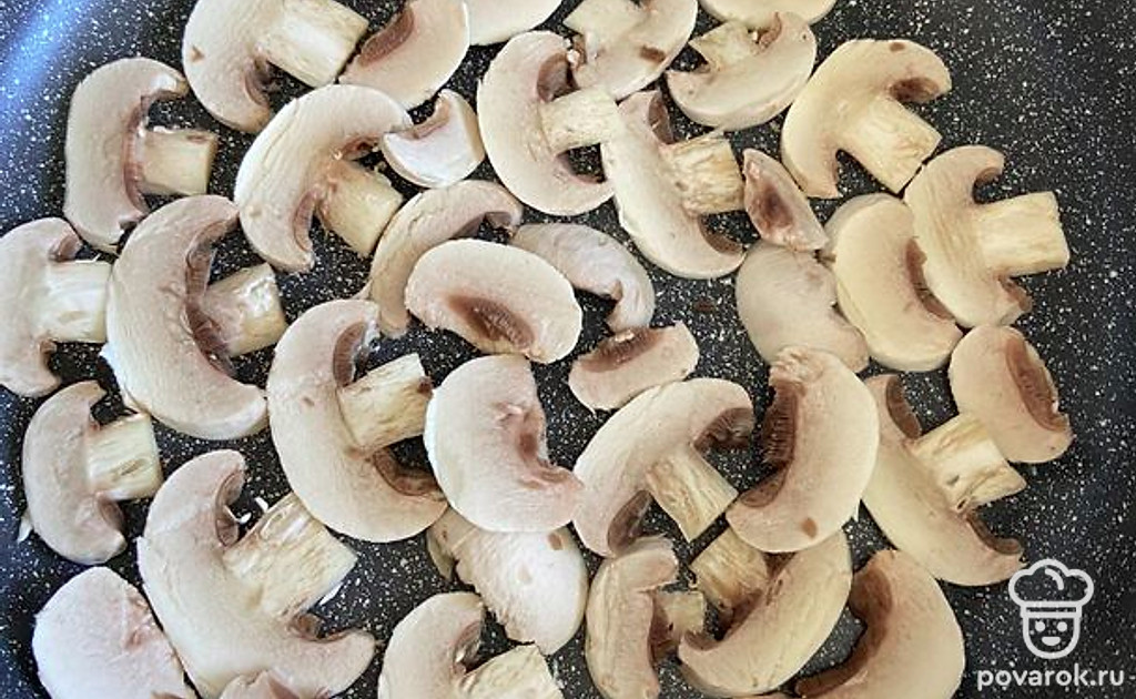 Нарежьте грибы слайсами, обжарьте их на сковороде с маслом 3 минуты.