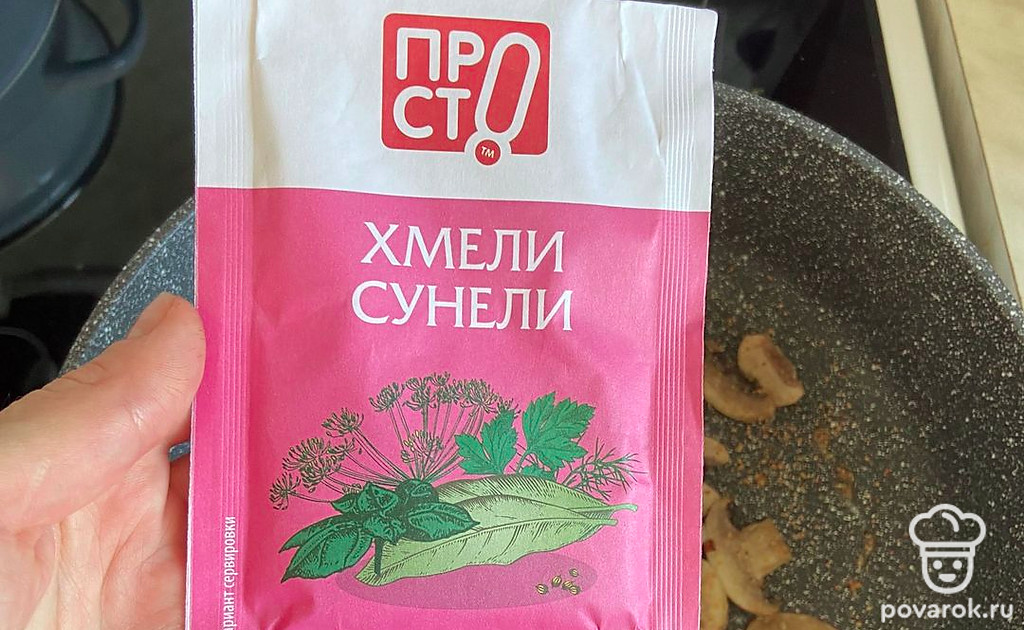 Добавьте соль, хмели-сунели, перемешайте и обжарьте до золотистости.