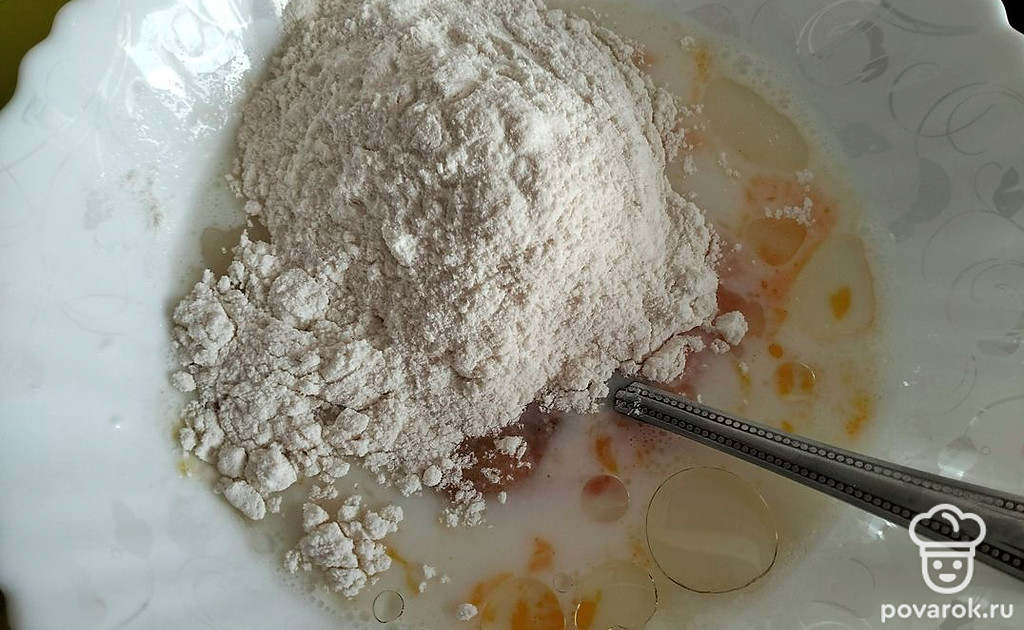 Добавить 1 столовую ложку масла, соду, муку и перемешать.
