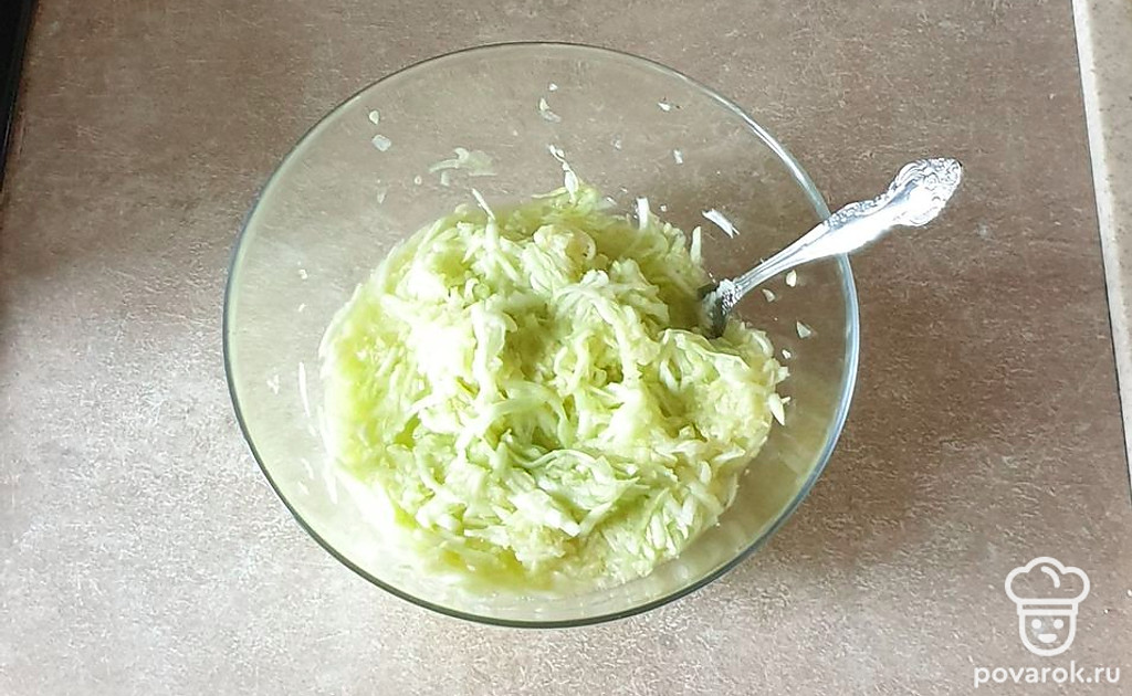Кабачок помойте и натрите на крупной терке. Выложите в миску, посолите и оставьте на 10 минут, чтобы вышла лишняя жидкость.