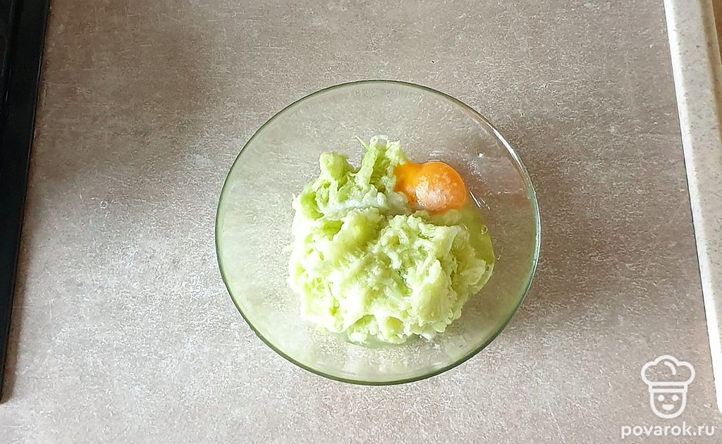 Слейте лишнюю жидкость и хорошо отожмите кабачок. Добавьте яйцо, перемешайте.