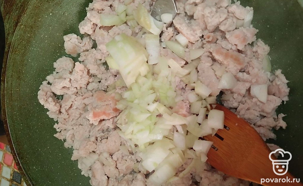 Когда фарш слегка обжарится, добавьте к нему нарезанный репчатый лук. Доведите начинку до готовности, посолите и поперчите.