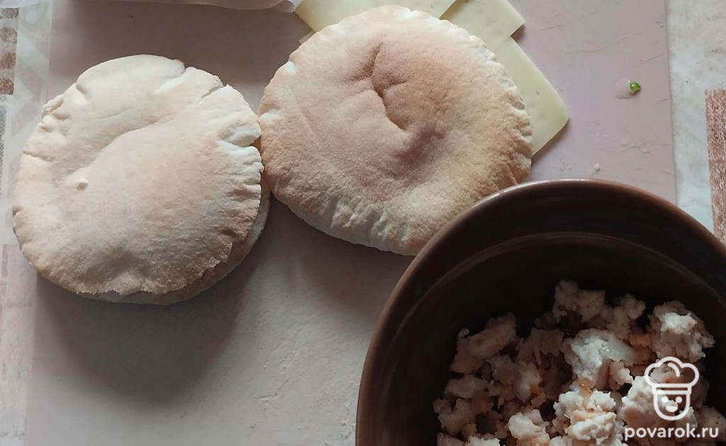 Сыр нарежьте тонкими ломтиками. Питу разрежьте вдоль и начините ее сыром и фаршем. Лепешки доведите до готовности в микроволновке или духовке, чтобы сыр расплавился.