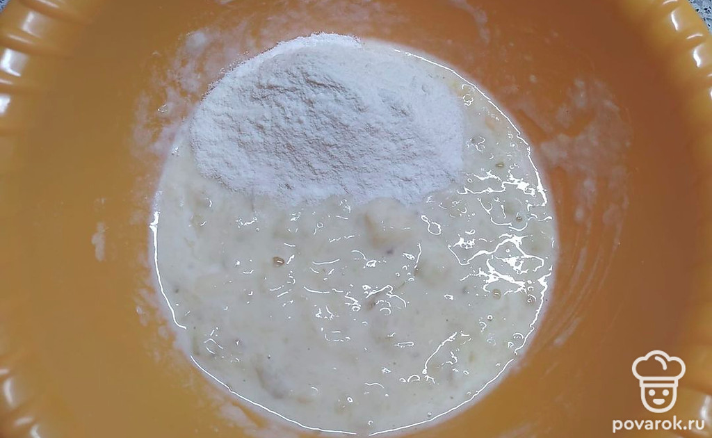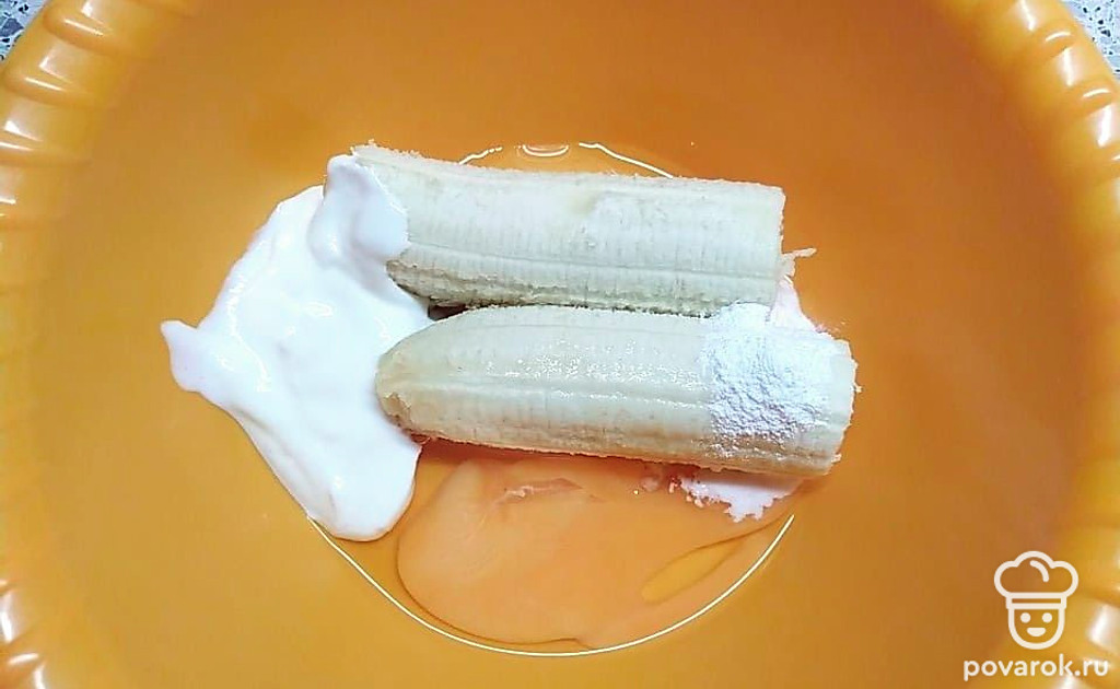 Смешать банан, яйцо, сметану и разрыхлитель. Измельчить все вилкой.