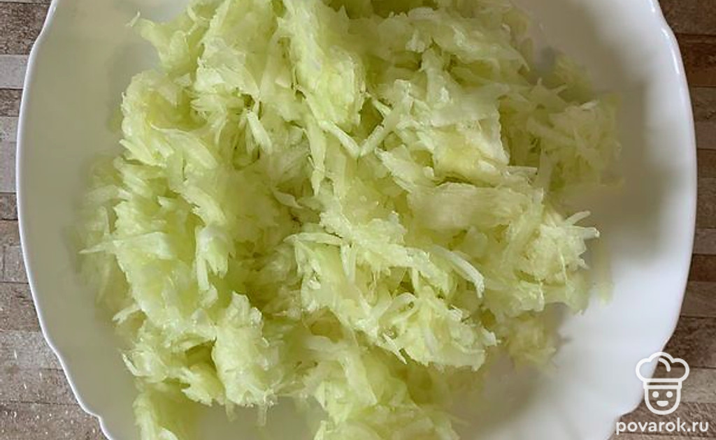 Почистить и натереть на терке кабачок. Отжать смесь.