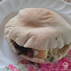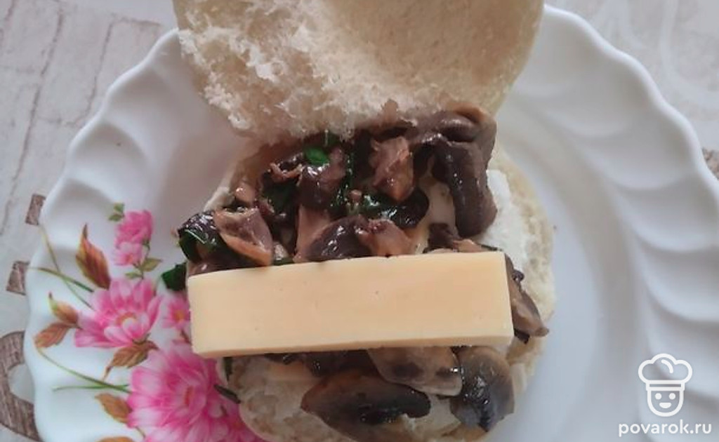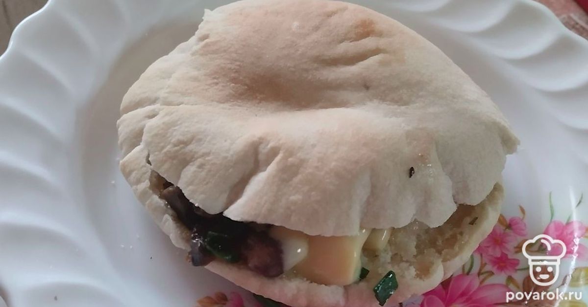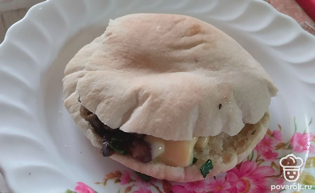 Отличный перекус или обед получается из питы с начинкой из жареных грибов и сыра.