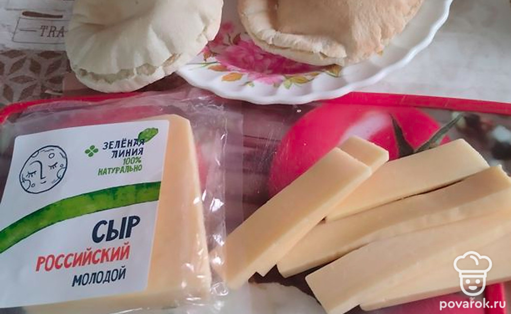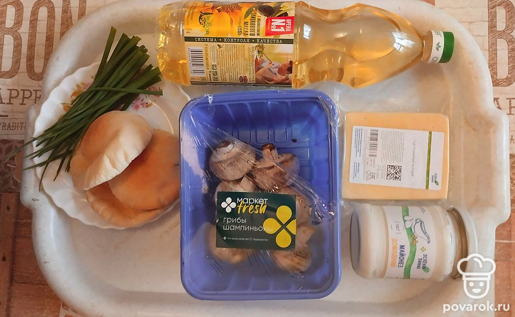 На майонез выложите сыр и грибы. Питу запеките в микроволновке, чтобы сыр расплавился.