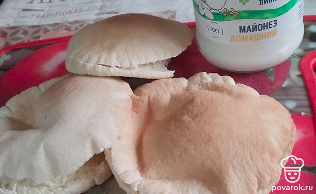 Лепешки разрежьте вдоль, смажьте внутри майонезом.