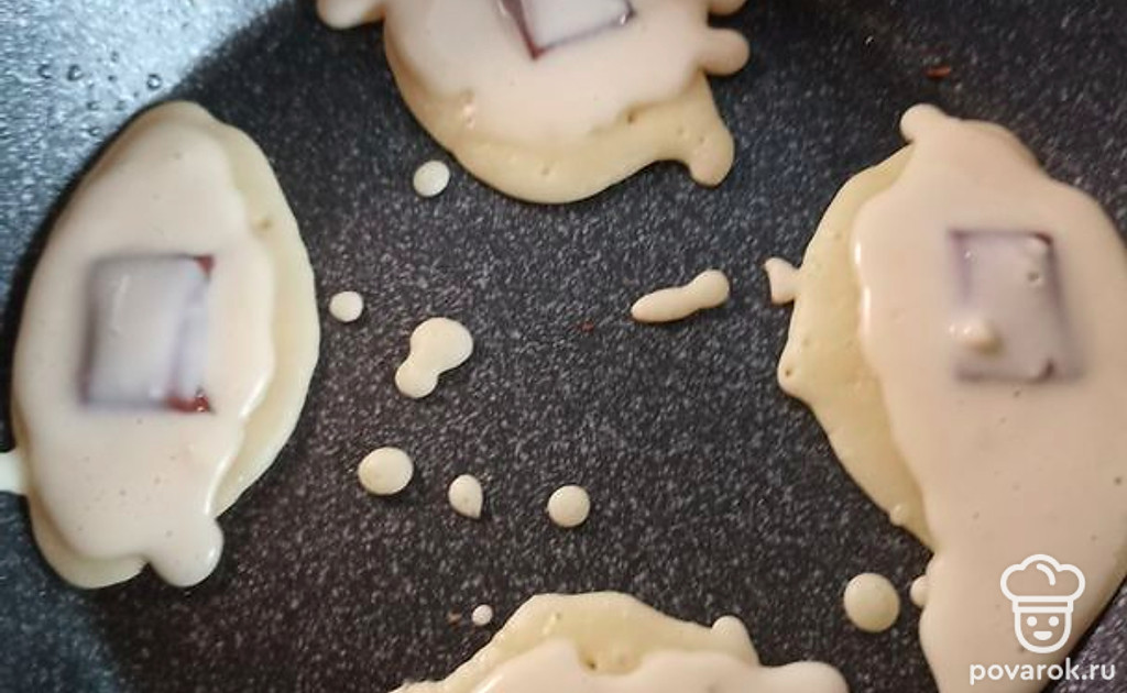 Выкладываем на сковородку часть теста. Кладем по одной дольке шоколада и заливаем вторым слоем теста. Обжариваем с двух сторон.