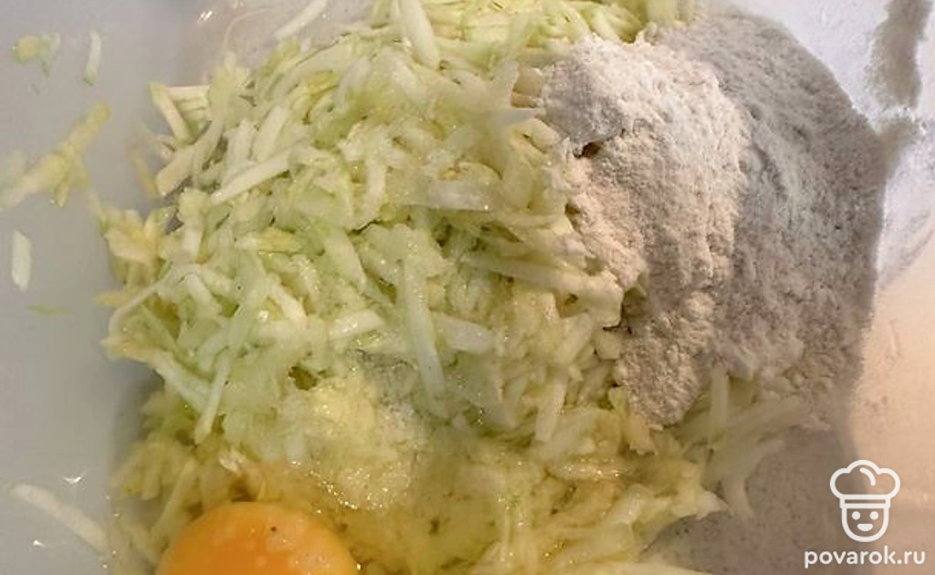 Добавляем яйцо, соль и муку. Хорошо перемешиваем.