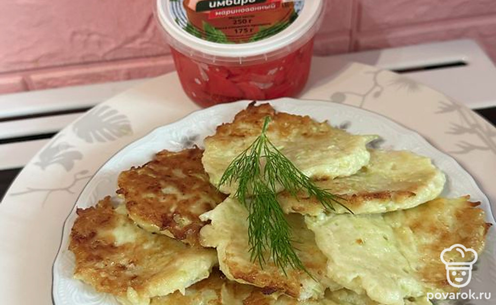 Подаем оладьи порционно, с маринованным имбирем и веточкой укропа. Приятного аппетита!