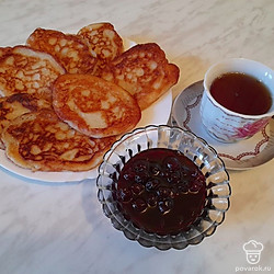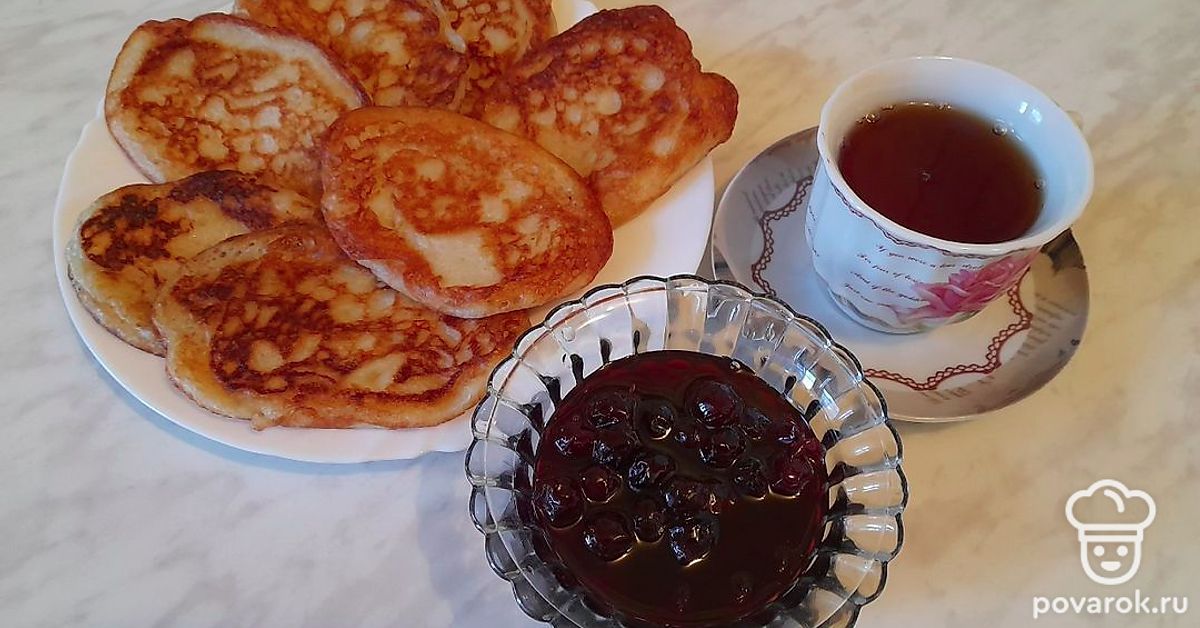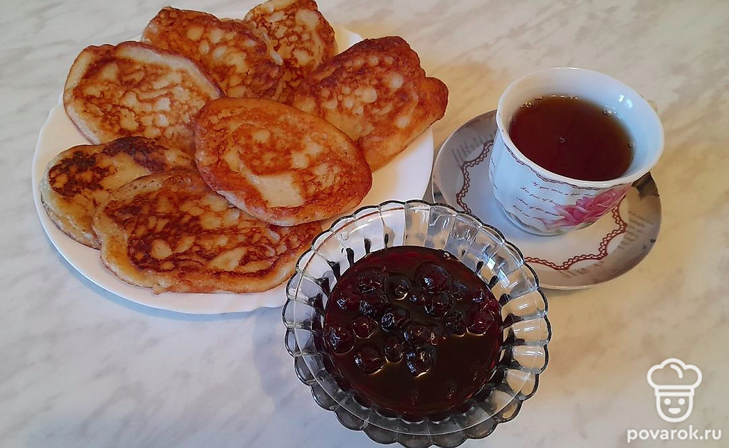 Оладьи подавайте с вареньем и горячим чаем. Приятного аппетита!