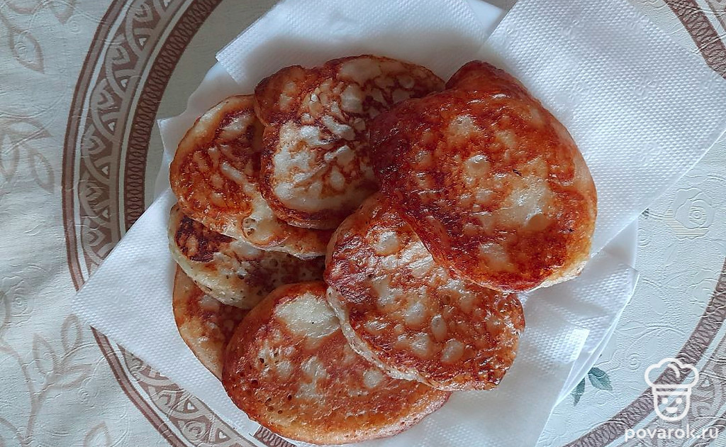 Готовые оладьи выложите на тарелку, застеленное бумажными салфетками. Они впитают лишнее масло.