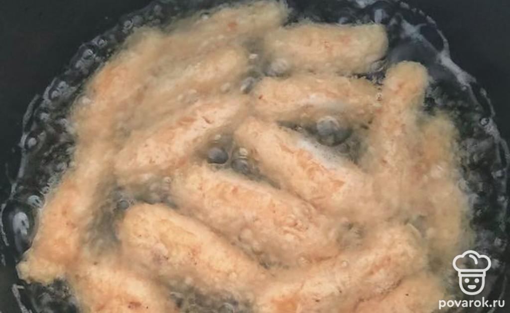 В мультиварку влейте растительное масло и включите режим «Жарка» или «Фритюр». После звукового сигнала опустите наши колбаски в кипящее масло.