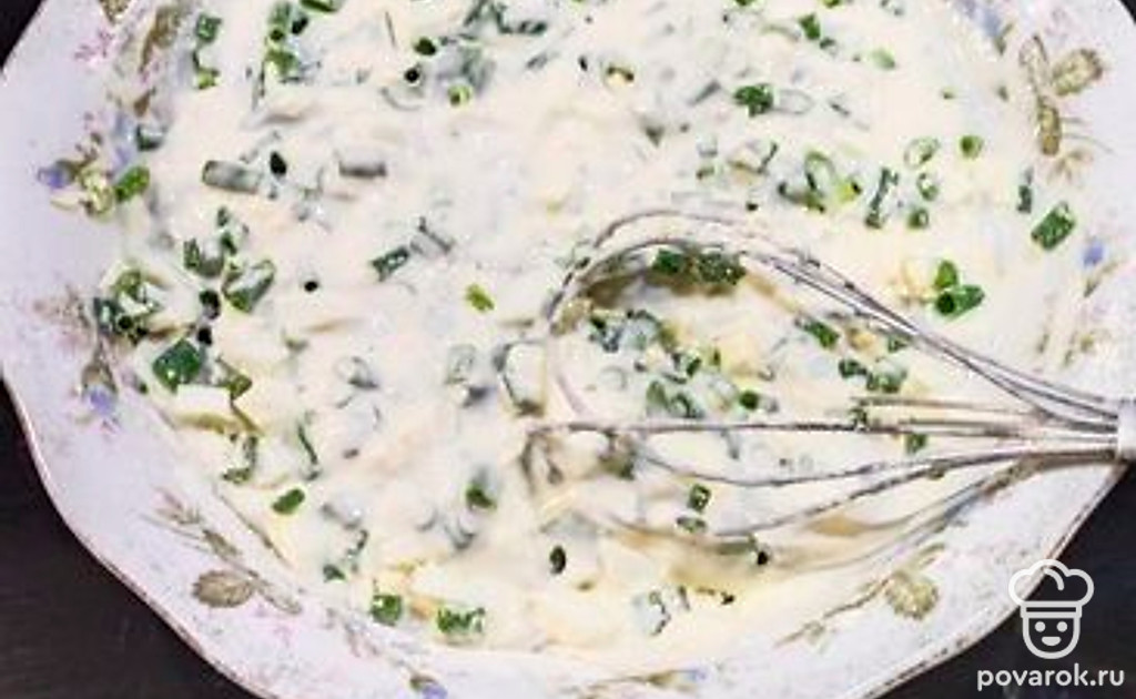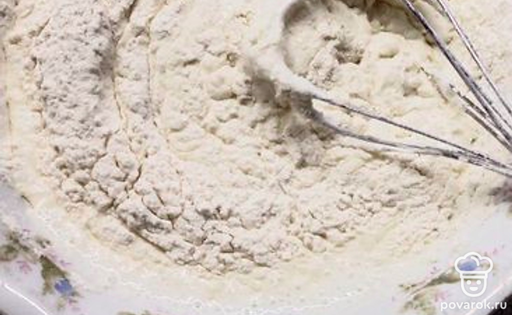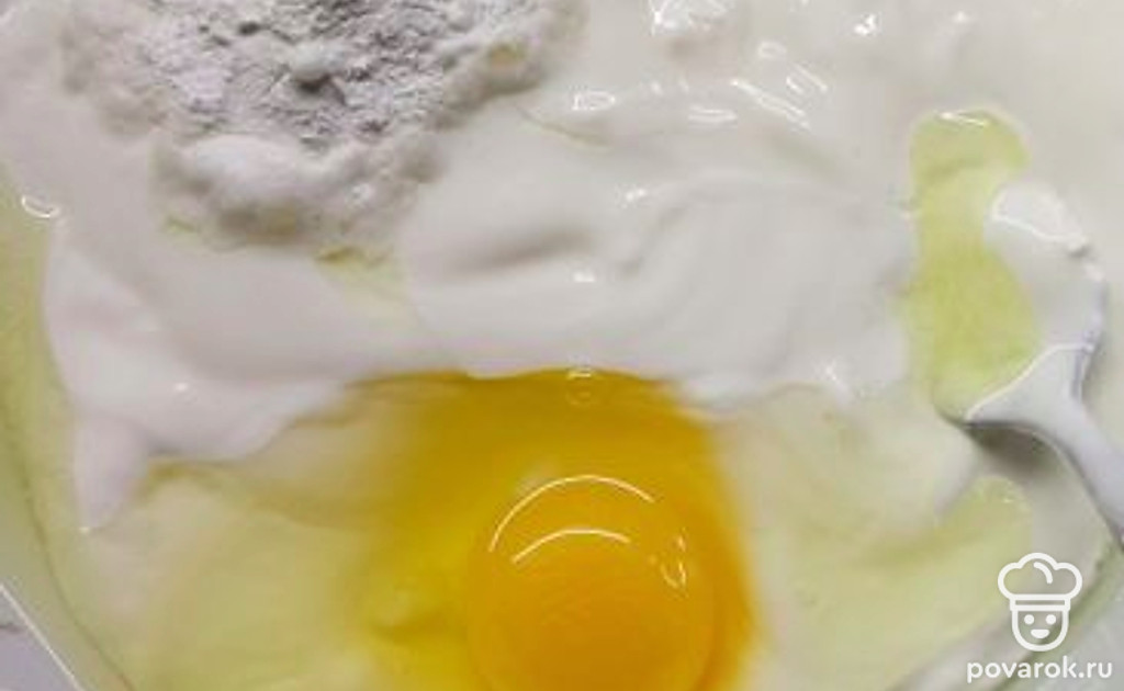 В сметану добавляем разрыхлитель и яйцо. Смешиваем.