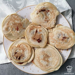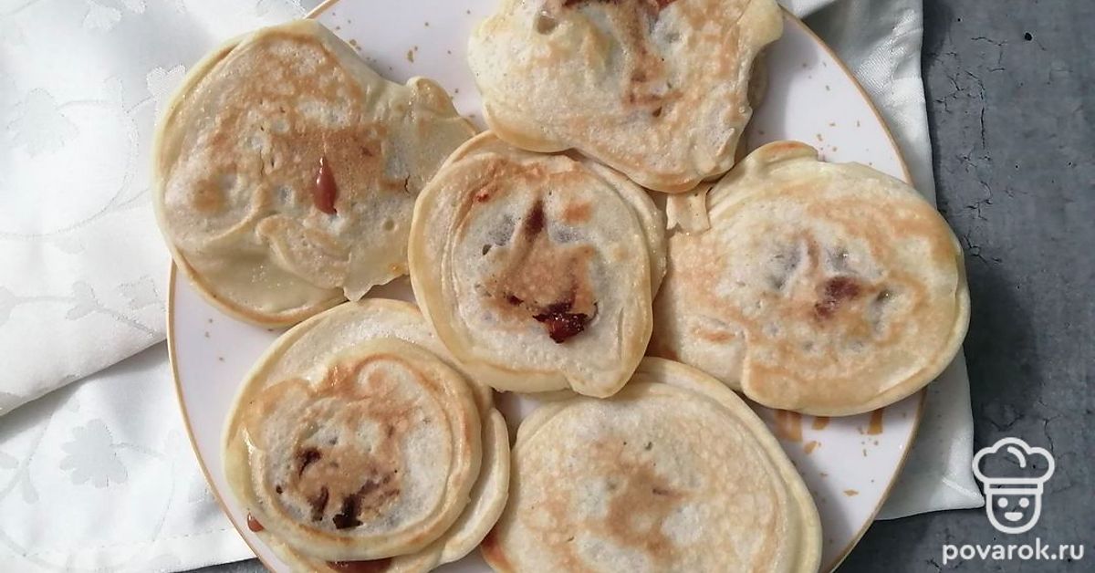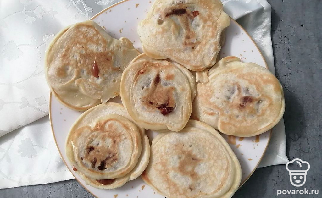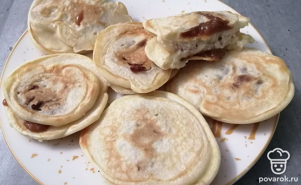 На оладушки выкладываем по 1 чайной ложке вареной сгущенки.