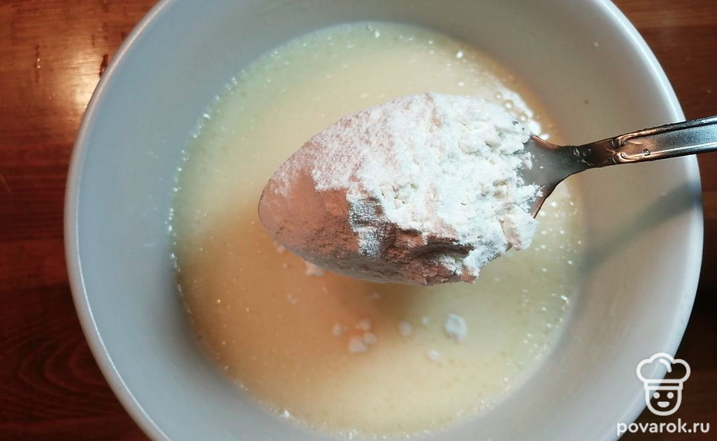 Вводим муку. Перемешиваем тесто до однородной массы, без комочков.