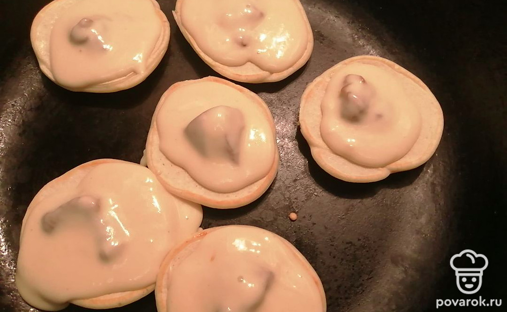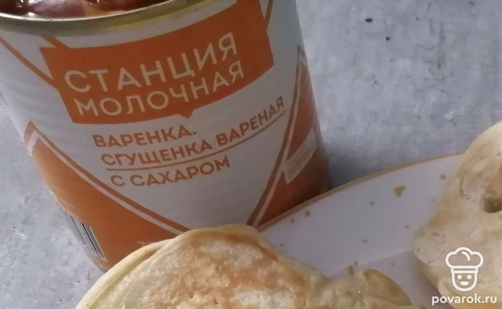 На сгущенку наливаем тесто. Жарим еще по 5 минут с каждой стороны.