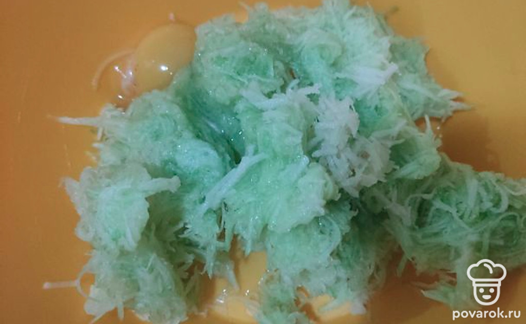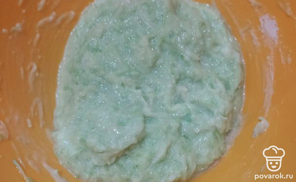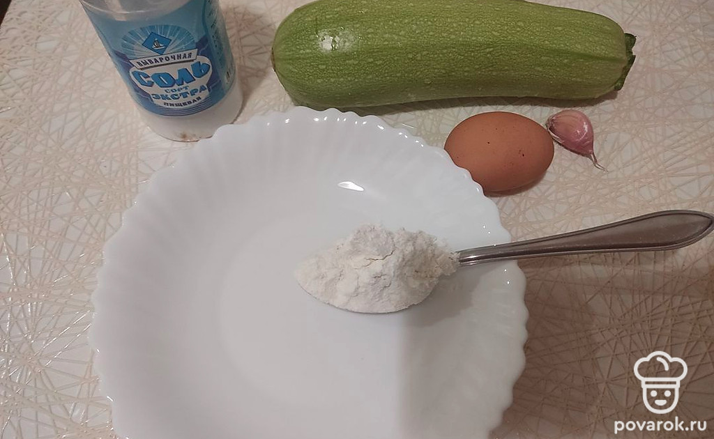 Кабачок моем, чистим и натираем на мелкой терке. Отжимаем кабачки, чтобы избавиться от лишней влаги. Добавляем яйцо, пропущенный через пресс чеснок, муку и соль. Все хорошо перемешиваем.