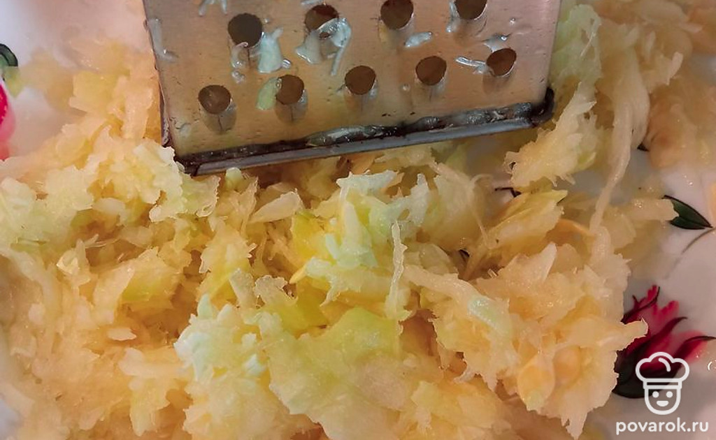 Кабачок вымыть, снять кожицу и натереть на крупной терке. Отжать овощ от сока. Солить нельзя, иначе кабачок даст сок и оладьи будут жидкие.