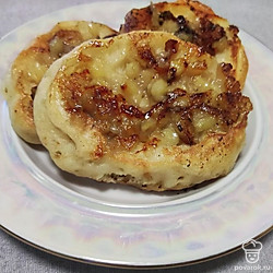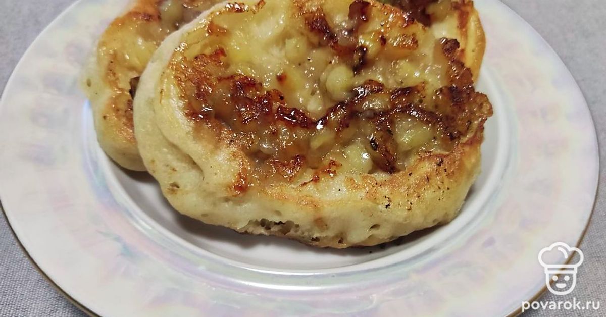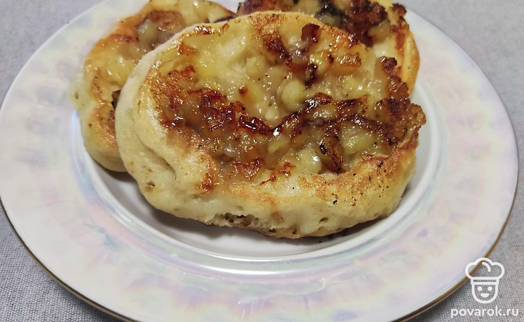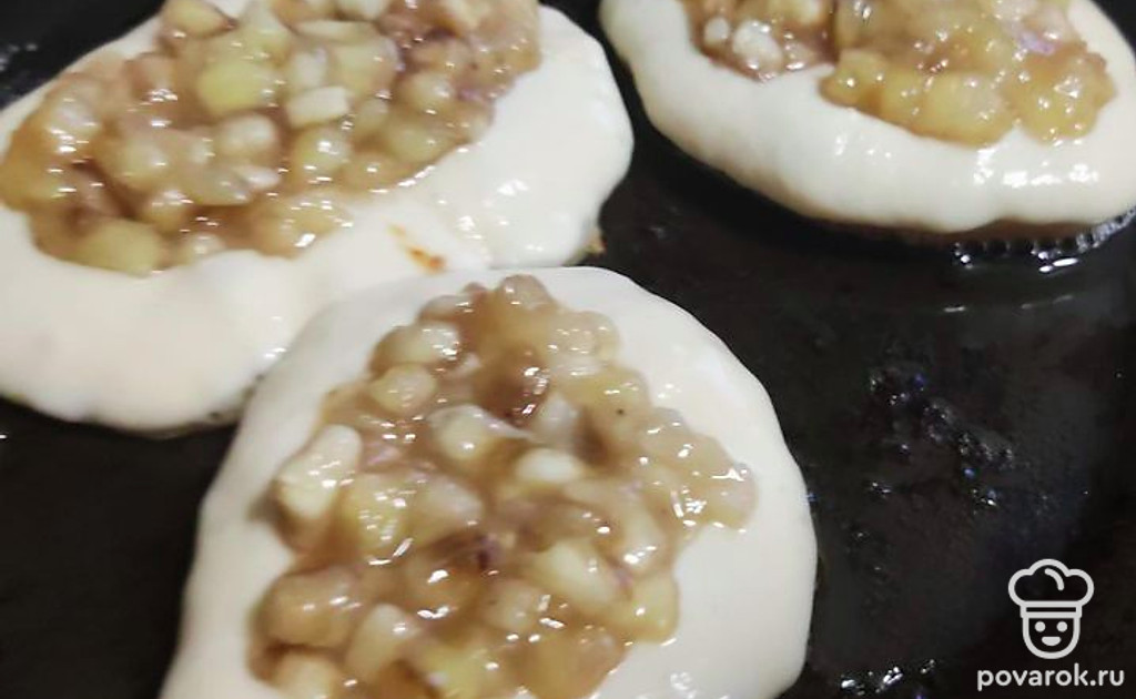 Оладьи сформируйте на нагретой сковородке, через 4 минуты выложите начинку. Переверните, обжарьте до готовности.