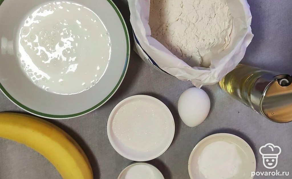 Подготовьте все ингредиенты. Просейте муку. Заранее достаньте яйцо и кефир. Продукты должны быть комнатной температуры. Банан очистите и нарежьте кубиками.