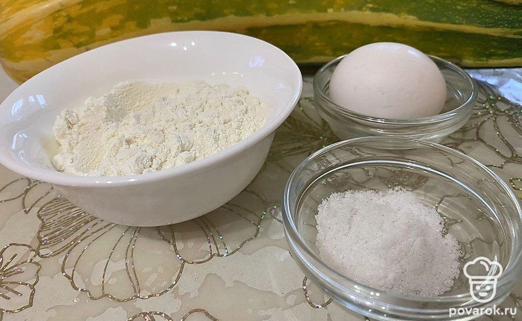 Кабачок почистите и натрите на крупной терке, добавьте чайную ложку соли, перемешайте и отожмите лишнюю воду из кабачка.