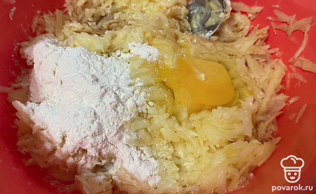 Чеснок почистите и натрите на мелкой терке, добавьте к кабачку. Также добавьте муку и разбейте яйцо. Перемешайте все ингредиенты.