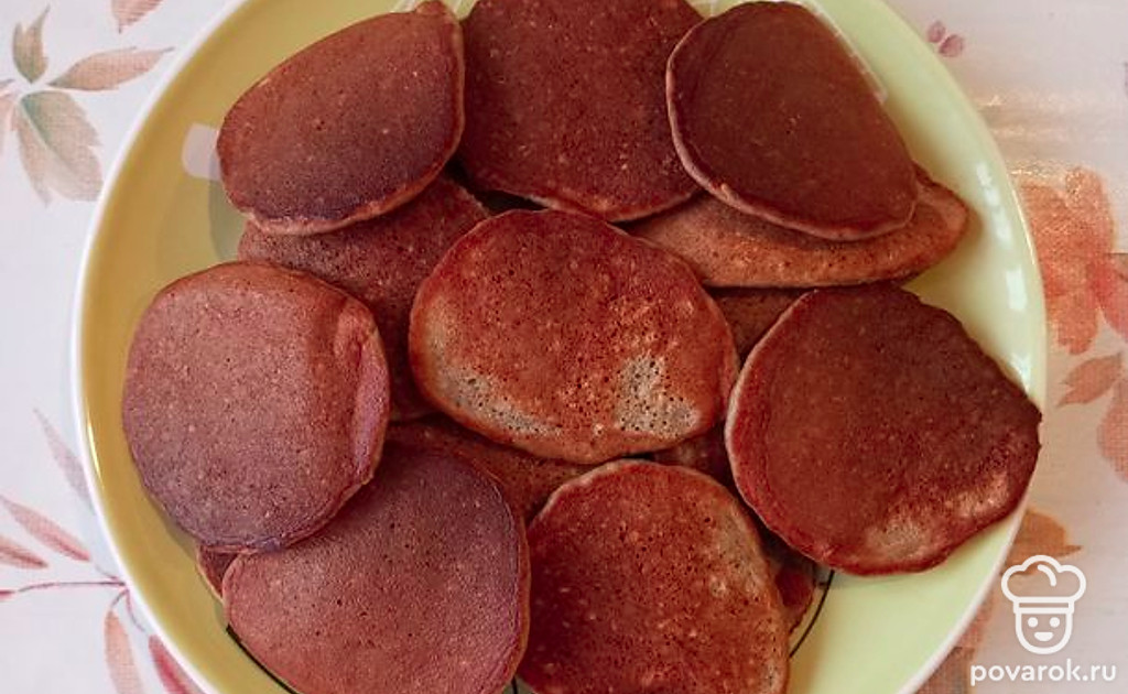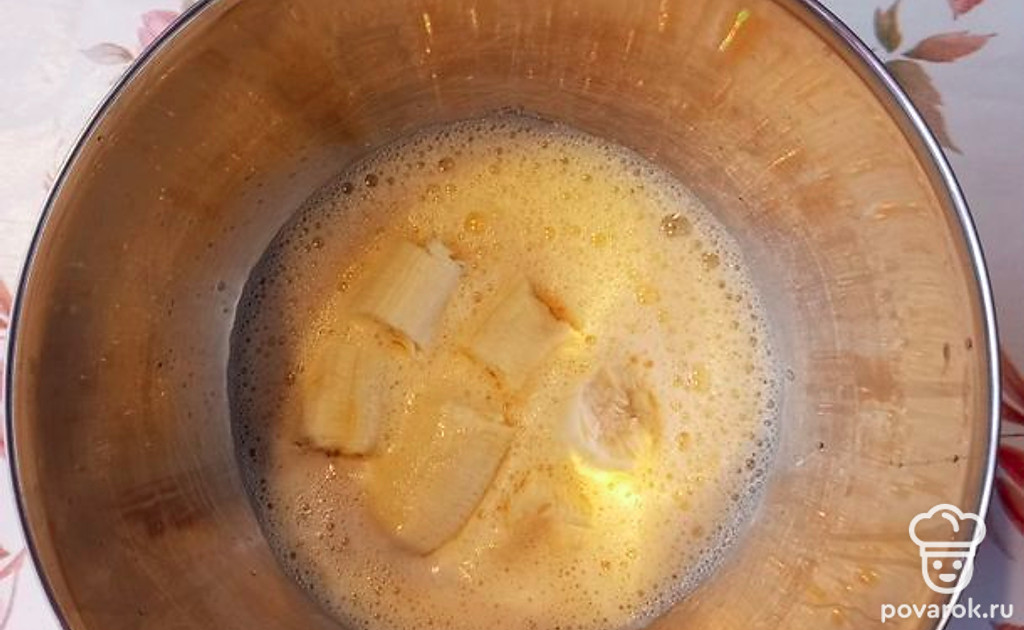 Добавить овсяные хлопья и разрыхлитель, пробить блендером.