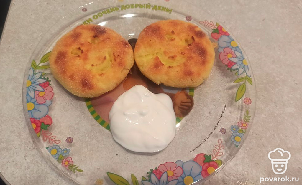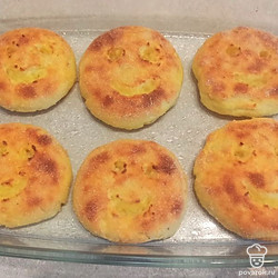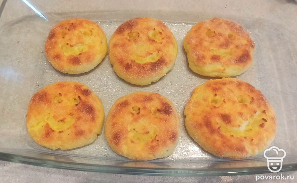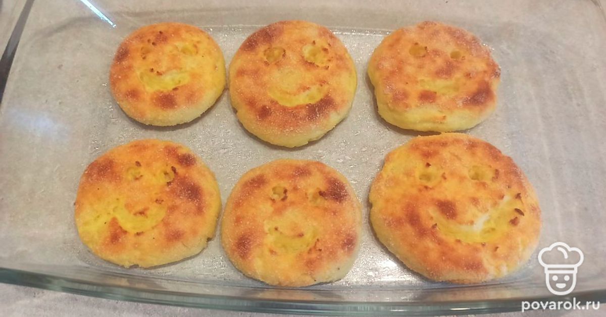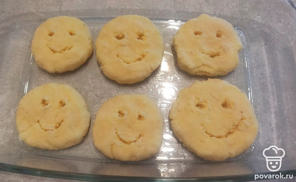 Форму для выпекания смазываем растительным маслом и выкладываем картофельные лепешки. Делаем глазки и улыбочки с помощью зубочистки. Ставим форму для выпекания в разогретую до 180 градусов духовку на 30 минут.