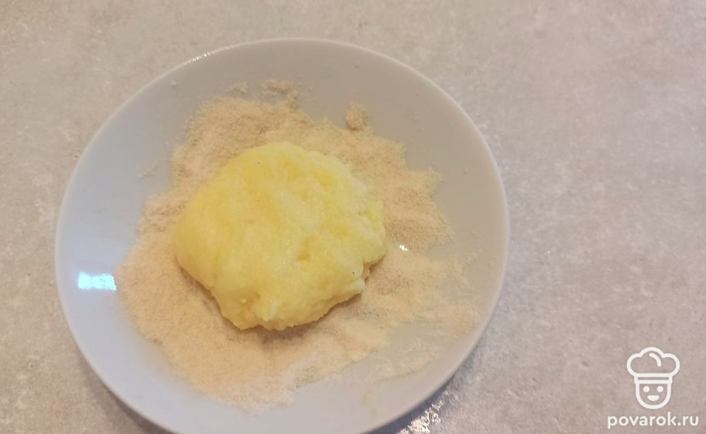 Формируем картофельные лепешки и обваливаем их в панировочных сухарях.