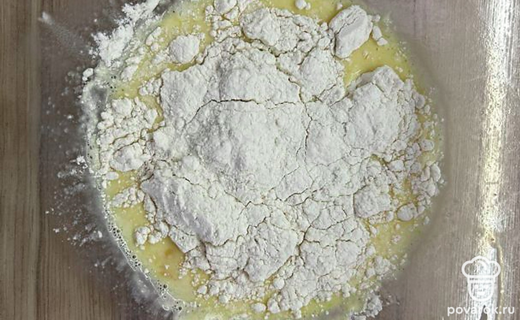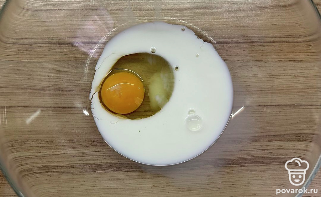 Разбейте в миску яйцо, добавьте молоко и взбейте. Добавьте в смесь сахар, валинин и разрыхлитель. Смешайте.
