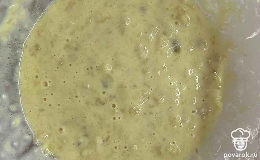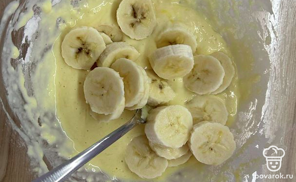 Выложите банановые кусочки в готовое тесто и разомните вилкой.