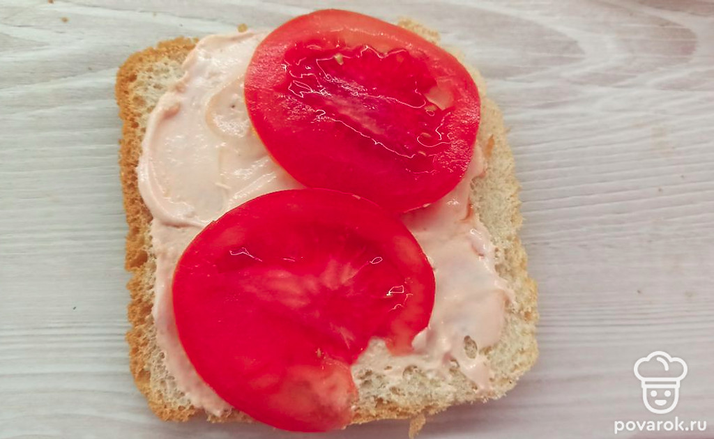 Смажьте один ломтик тостового хлеба соусом. Нарежьте помидор.