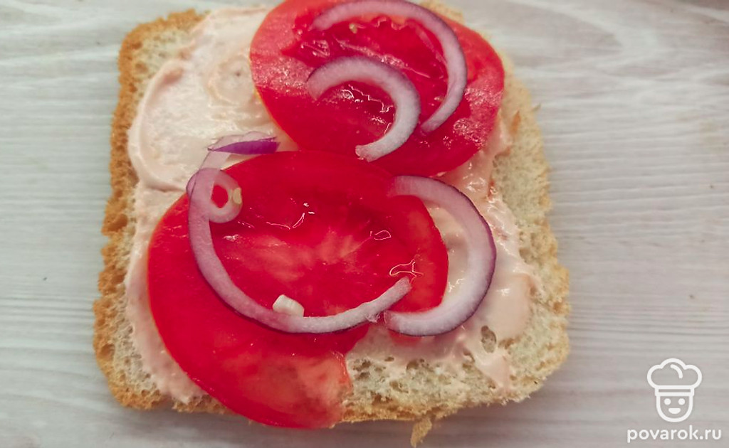 Нарежьте полукольцами лук и выложите поверх помидора.