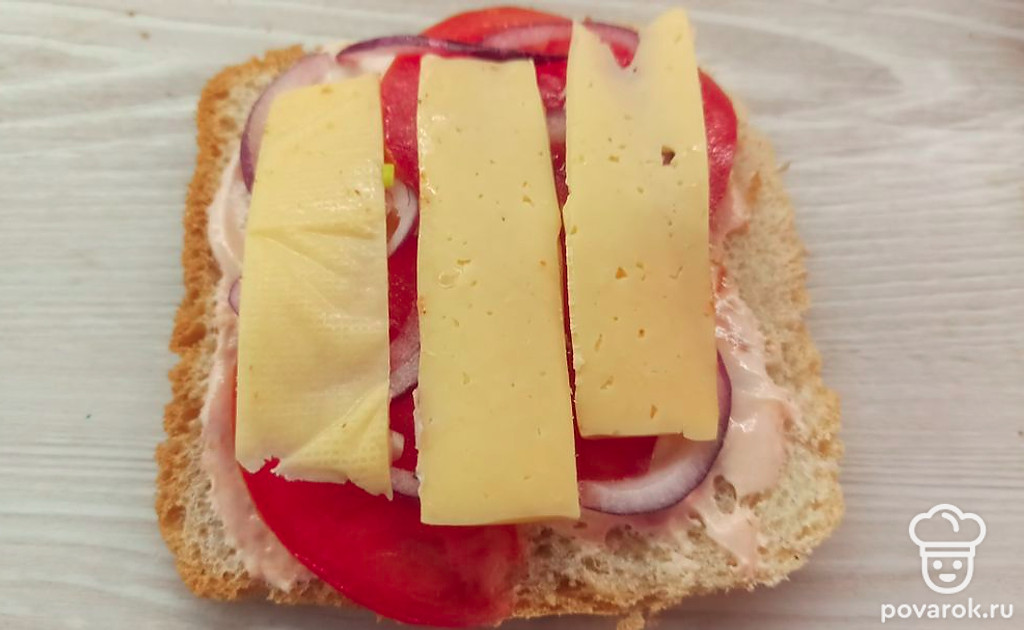 В конце нарежьте сыр и выложите на тостовый хлеб. Накройте начинку вторым ломтиком тостового хлеба.