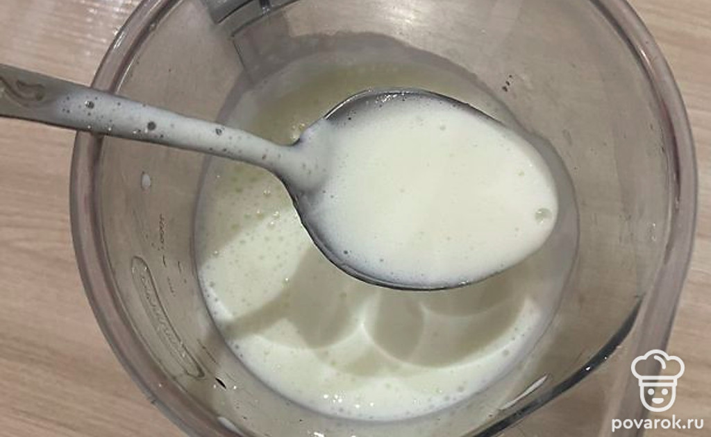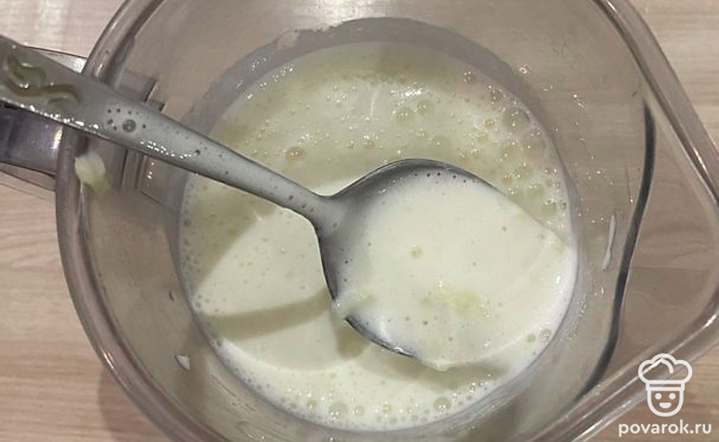 Налейте кефир в глубокую чашку. Добавьте туда яйцо, сахар и гашенную в уксусе соду. Хорошо перемешайте.