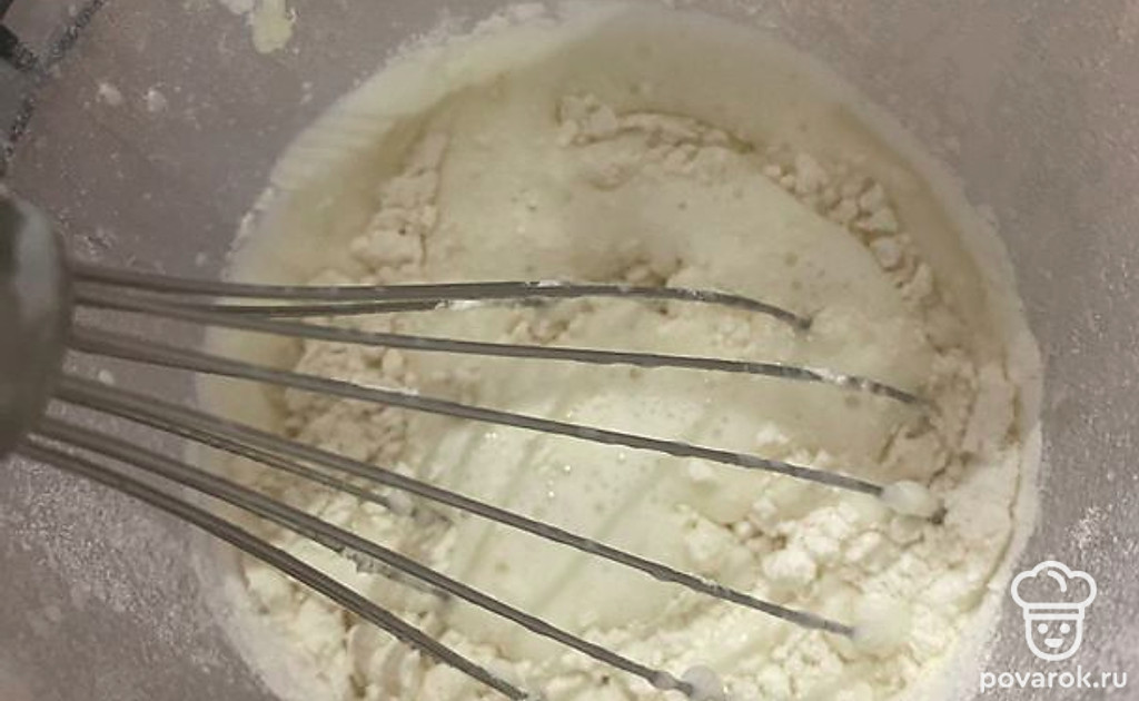 Перемешивайте венчиком полученное тесто, постепенно вводя просеянную муку. Можете добавлять по полстакана. Нужно получить массу консистенции густой сметаны. Муки может понадобиться немного больше или меньше.