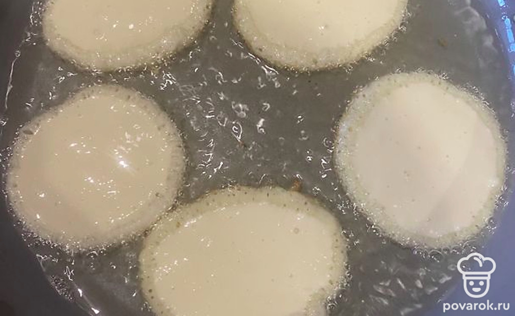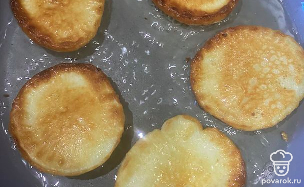Жарьте оладьи с одной стороны на среднем огне примерно 2 минуты, до румянца. Затем переверните, зацепив вилкой.