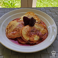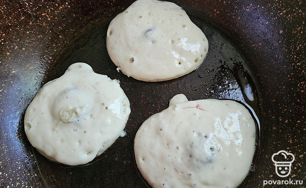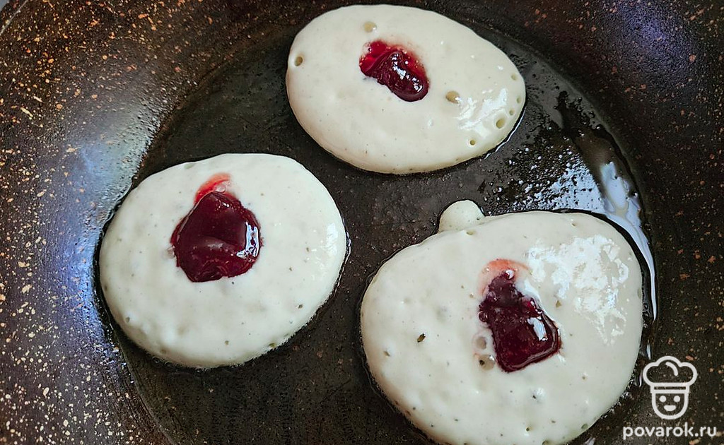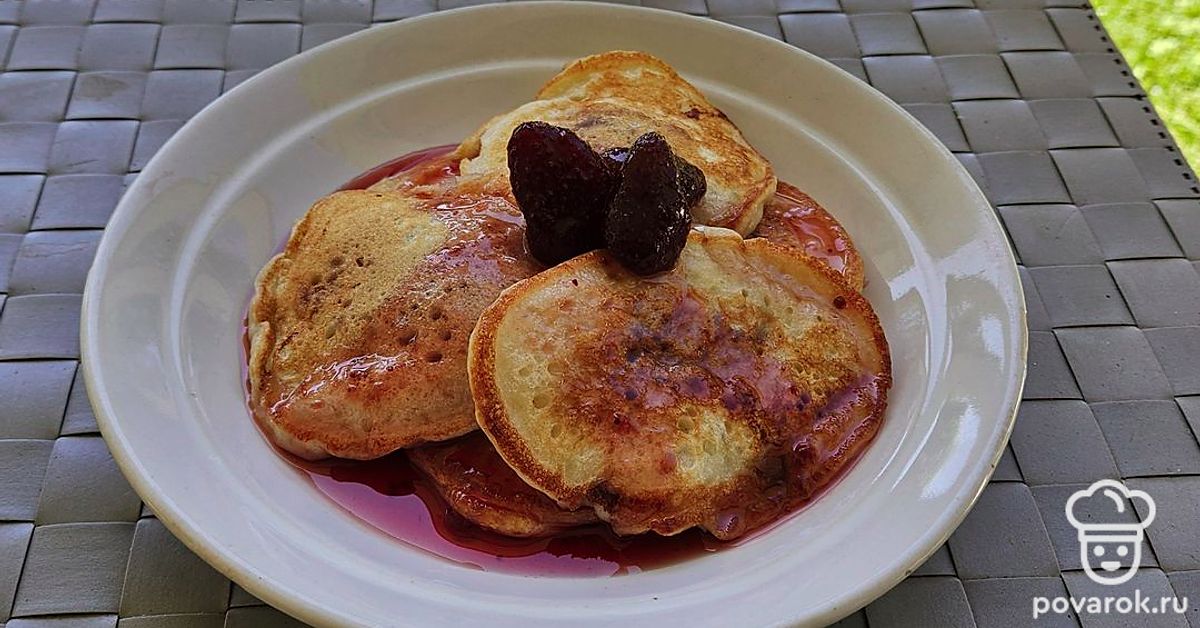 Подавайте оладьи сразу после приготовления. По желанию, можете украсить вареньем из клубники.