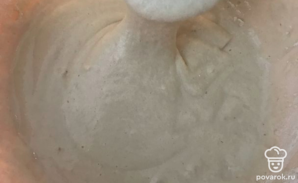 Постепенно просейте муку. Должна получиться консистенция густой сметаны.