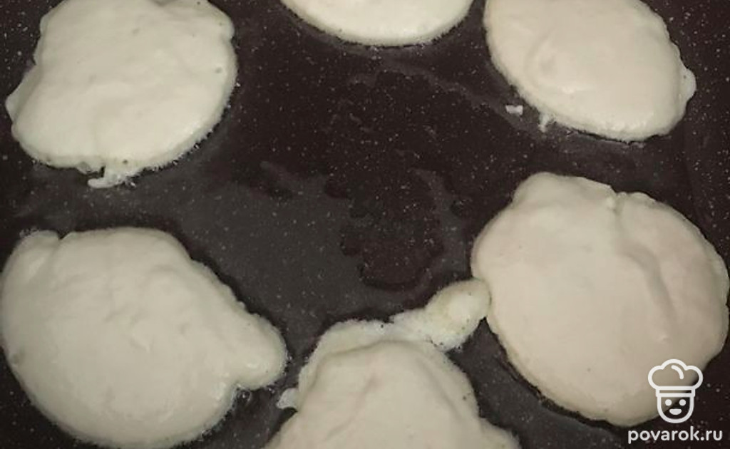 Жарьте оладьи с одной стороны на разогретой с растительным маслом сковороде примерно 1-2 минуты. Затем переверните, накройте крышкой и уменьшите огонь. Обжарьте 2 минуты, чтобы оладушки пропеклись.